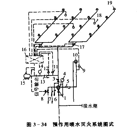 1-總控制閥;2-預(yù)作用閥;3-檢修閘閥;4-壓力表;5-過濾器;6-截止閥;7-手動(dòng)開啟截止閘;8-電磁閥;9-壓力開關(guān);10-水力警鈴;11-壓力天關(guān)(啟閉空壓機(jī))12-低氣壓報(bào)警壓力開關(guān);13-止回閥;14-壓力表;15-空壓機(jī);16-火災(zāi)報(bào)警控制箱;17-水流指示器;18-火災(zāi)探測(cè)器;19-閉式噴頭預(yù)作用噴水滅火系統(tǒng)工作原理:發(fā)生火災(zāi)時(shí),火災(zāi)探測(cè)器報(bào)警后,自動(dòng)控制系統(tǒng)控制閘門排氣、充水,由干式變?yōu)闈袷较到y(tǒng)。只有當(dāng)著火點(diǎn)溫度達(dá)到開啟閉式噴頭時(shí),才開始噴水滅火。
